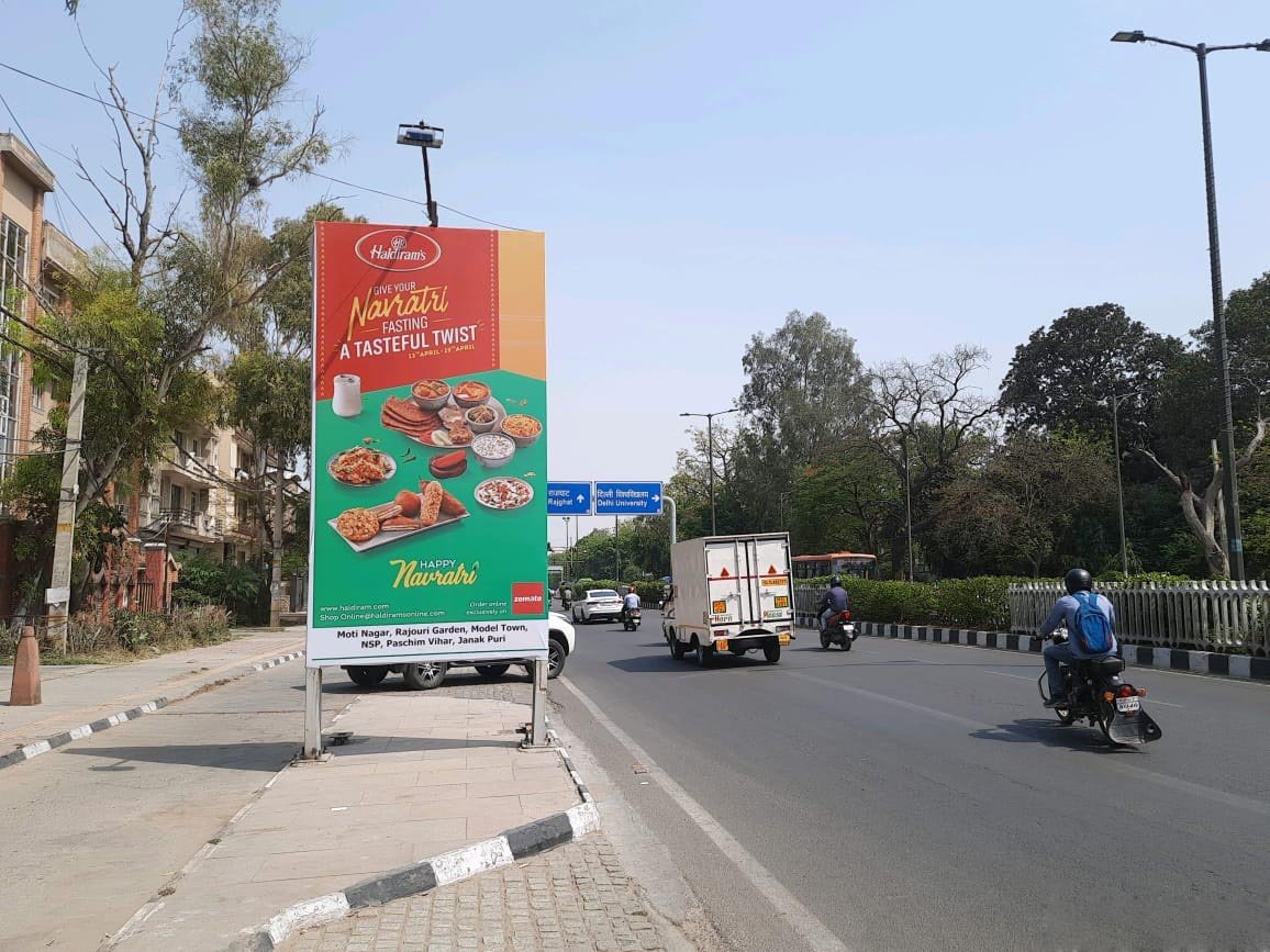 Positioned outside the Croma Store at the busy Lucknow Road Crossing, this 98 sq. ft. front-lit mini unipole ensures strong visibility to vehicular and pedestrian traffic. Excellent for tech, appliance, or automobile brands targeting North Delhi’s retail zones.